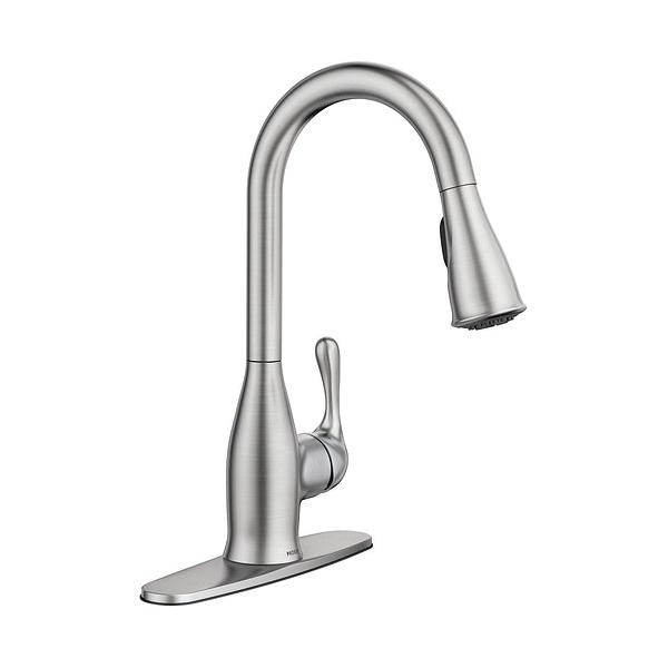 MOEN® Kitchen Faucet, Kaden™ Collection, Pull-Out Faucet Configuration, Stainless Manufacturer Finish, No Finish Group Finish Family, 1-Handle, Lever Handle Style, 1.5 gpm Flow Rate, 15-1/4 in Spout Height, 7.85 in Spout Reach, High-Arc Spout, 2-1/2 in Maximum Deck Thickness, 3/8 in Connection, Compression Connection, ADA Compliant, 3-Spray Functions, 60 psi Pressure, Brass Handle Material
