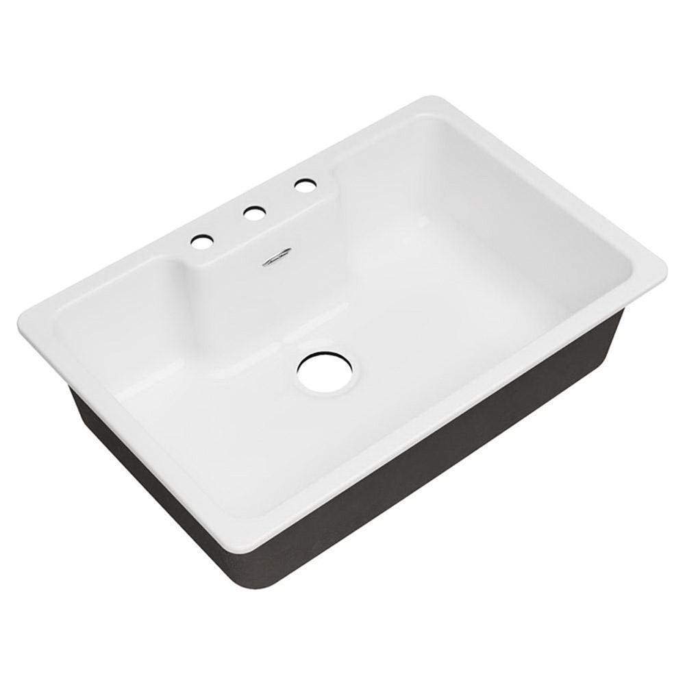 American Standard Kitchen Sink, Quince® Collection, 3-9/16 in Drain, 8 in Faucet Center, Cast Iron, Brilliant White, 3 Holes, Drop-In Mounting, 1 Bowls, Rectangular Shape, Sink Bowl Size (Single or Left): 19-5/16 in L x 30-1/4 in W x 9-3/8 in D, 36 in Minimum Cabinet, 1-3/8 in Faucet Hole, 22 in Length, 33 in Width, 9-3/8 in Height, Domestic/Import: Import